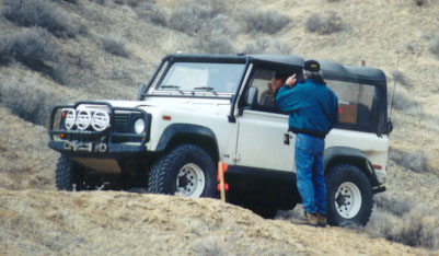 E1: Driver Cas Stimson and Navigator Jim Smithley receiving written instruction from Bill Turpie in the Trophy course in a Defender 90 V8 Automatic.